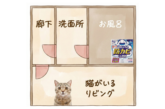 猫は安全な場所にはいたのですが、この後、防カビくん製剤が漏れ出た廊下や洗面所を行動させて本当に大丈夫なのか、心配になりました。