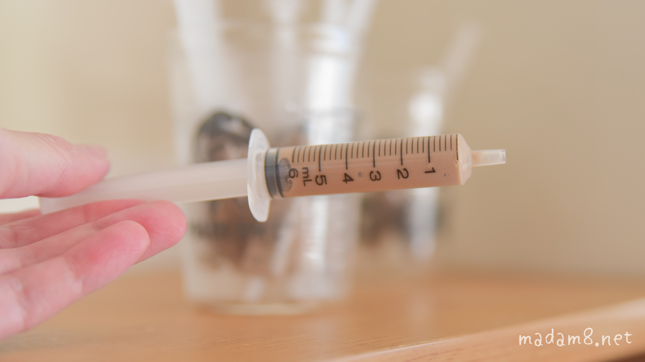 また、うちの子は当時5mLのシリンジが最も上手に飲んでくれたので5mLを使っていましたが、10mL以上のシリンジで上手に飲める子なら、そのほうが効率的です。